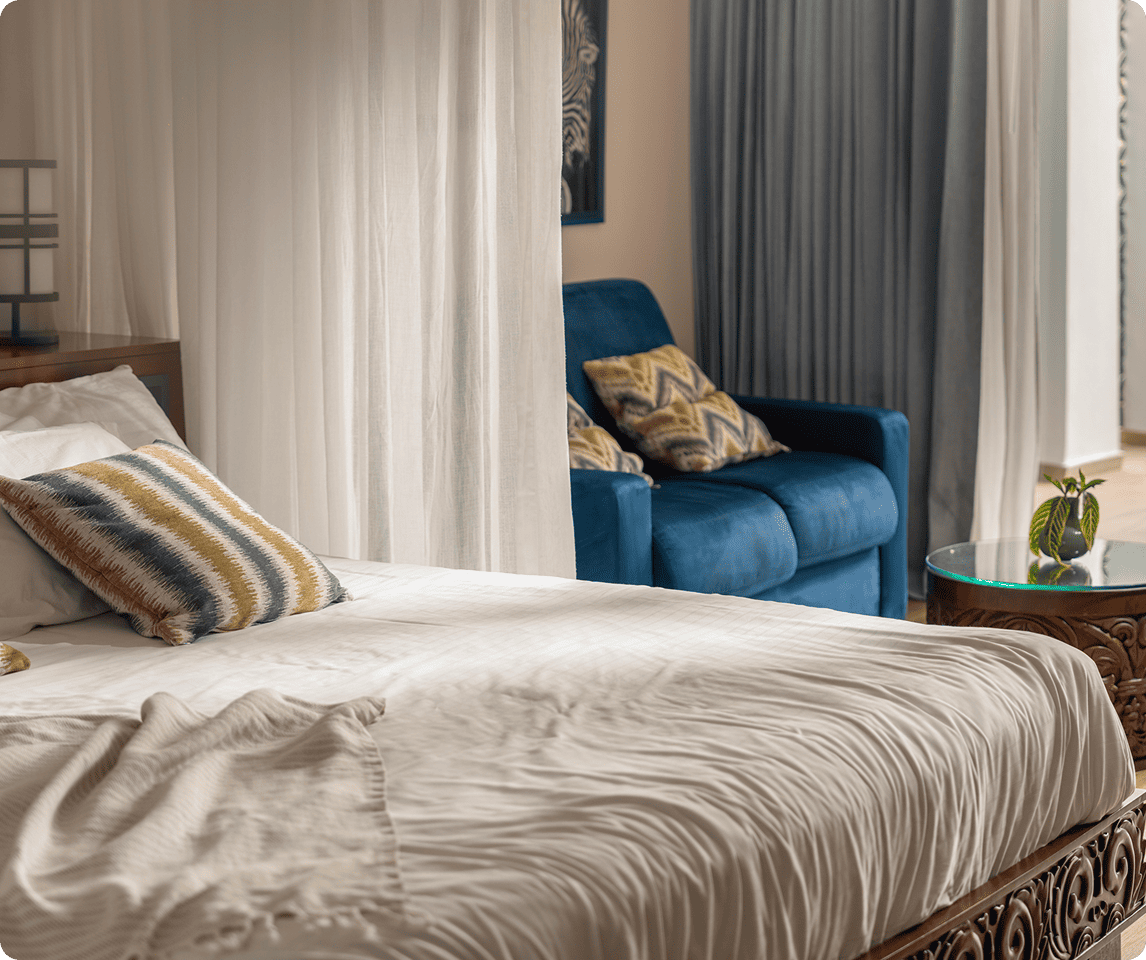Your private space should be a haven of peace and sophisticated comfort. Our accommodations are meticulously designed to be personal sanctuaries where you can unwind in absolute privacy, ensuring every guest feels completely at ease. Each suite is a testament to understated luxury, blending natural materials with elegant design to create an atmosphere of restorative calm.